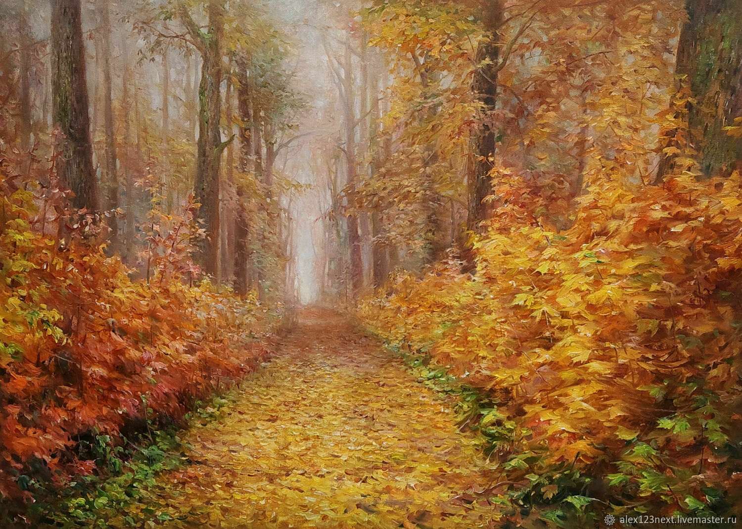 В центре композиции картина аллея предстает как идеальный осенний пейзаж, где опавшие листья устилют землю мягким, шуршащим покрывалом. Воздух кажется наполненным ароматом прелой листвы и свежестью приближающегося холодов, хотя мазки кисти несут тепло солнечных лучей. Деревья по бокам аллеи стоят в полупрозрачной дымке, их кроны еще хранят редкие вспышки желтого и красного, подчеркивая неизбежность увядания.